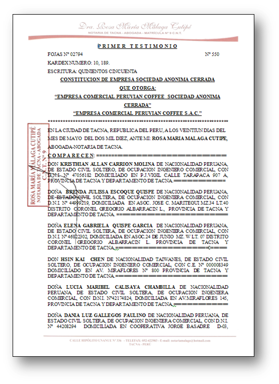 Una vez elevada la minuta, no se puede cambiar. Al final, se genera la Escritura Publica, Testimonio de sociedad o Constitución Social, que es el documento que da fe de que la minuta el legal. Esta debe ser firmada y sellada por el notario.